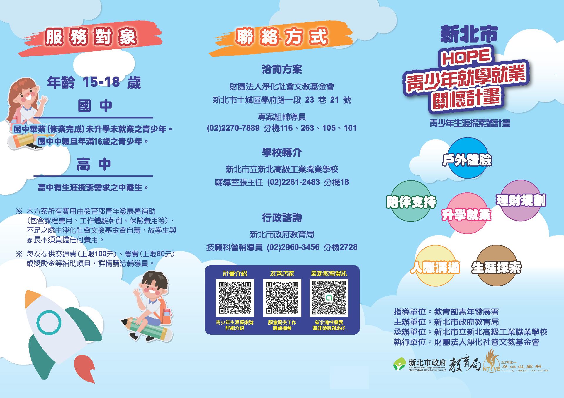 針對國中畢業未升學未就業之青少年、國中中輟且年滿16歲之青少年及高中有生涯探索需求之中離生提供職涯輔導、生涯探索及工作體驗等服務,詳細服務內容及聯絡方式如下: