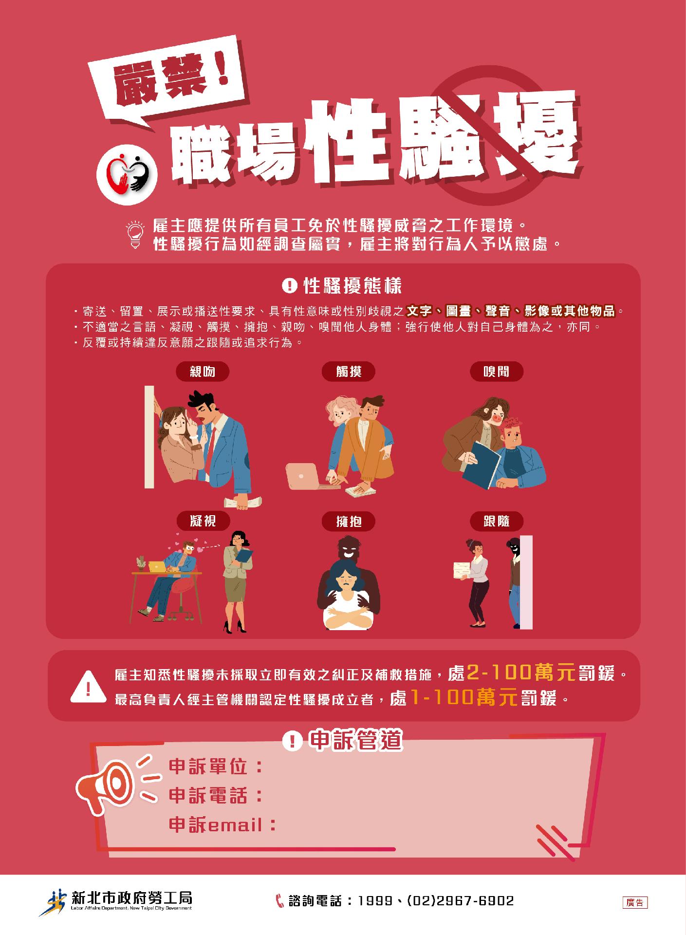 新北市就業歧視暨職場性騷擾申訴及諮詢專線:02-29676902
